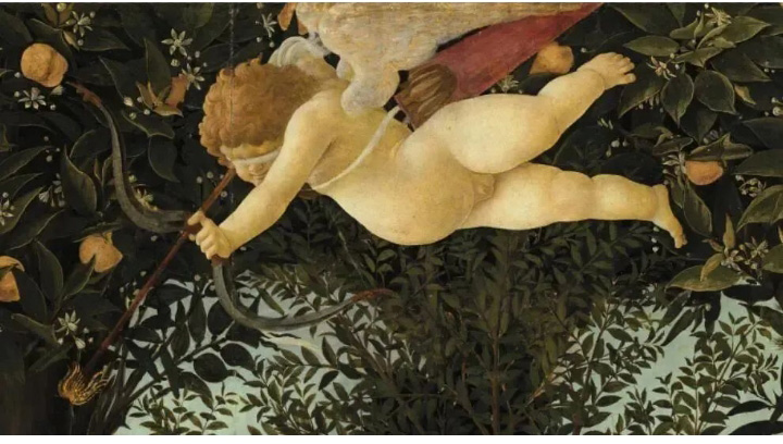 維納斯頭頂上飛翔著小愛神丘比特,丘比特正蒙著雙眼發(fā)射金箭。