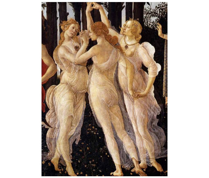赫爾美斯之后是身著透明紗衣,身材修長的美惠三女神,她們在松軟的草地上翩翩起舞,面帶清愁。