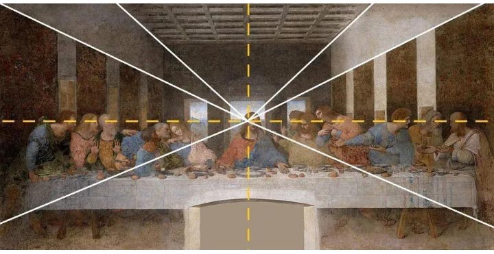 達·芬奇不僅在繪畫技藝上力求創(chuàng)新,在畫面的布局上也別具新意。一直以來,畫面布局都是耶穌弟子們坐成一排,耶穌獨坐一端。達·芬奇卻讓十二門徒或坐或站于耶穌兩邊,耶穌孤寂地坐在中間,他的臉被身后明亮的窗戶映照,顯得莊嚴(yán)肅穆,在透視方面,是一幅典型的焦點透視作品。