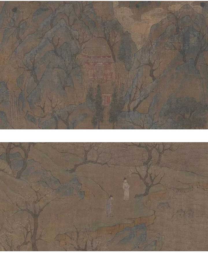 山的描繪用單線勾勒,填以青綠,山腳用泥金,金碧富麗;近處的樹勾出樹干,作上叉如鹿角的樹枝,松身不畫鱗,直接以赭石填染,松枝不畫細(xì)針,只用石綠沉點(diǎn);人物用筆點(diǎn)成后,加重色于上,勾線分出衣折。