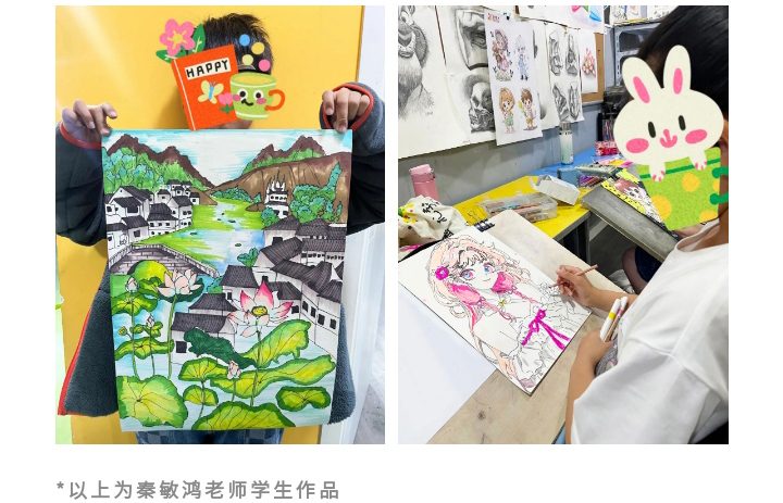 而恰巧作為動畫專業(yè)的秦敏鴻老師,在自身藝術(shù)的學(xué)習(xí)中,動漫有著很大的影響?!靶〉臅r候,我喜歡各種動漫人物,那些天馬行空的動畫情節(jié)讓我知道原來想象力可以用畫筆表達(dá),藝術(shù)可以帶你抵達(dá)去不了的遠(yuǎn)方。”很多人覺得喜歡動漫也許會“玩物喪志”,但卻忘了在興趣在孩子們成長中的重要性。“畫動漫在一定程度上也可以夯實(shí)繪畫基礎(chǔ),在我大學(xué)學(xué)習(xí)動畫期間,創(chuàng)作一幅完整的動漫插畫,要勾線、分層上色、加特效,甚至設(shè)計背景故事,這種沉浸式投入,比強(qiáng)迫刷題更能培養(yǎng)耐心。”秦敏鴻老師說道。