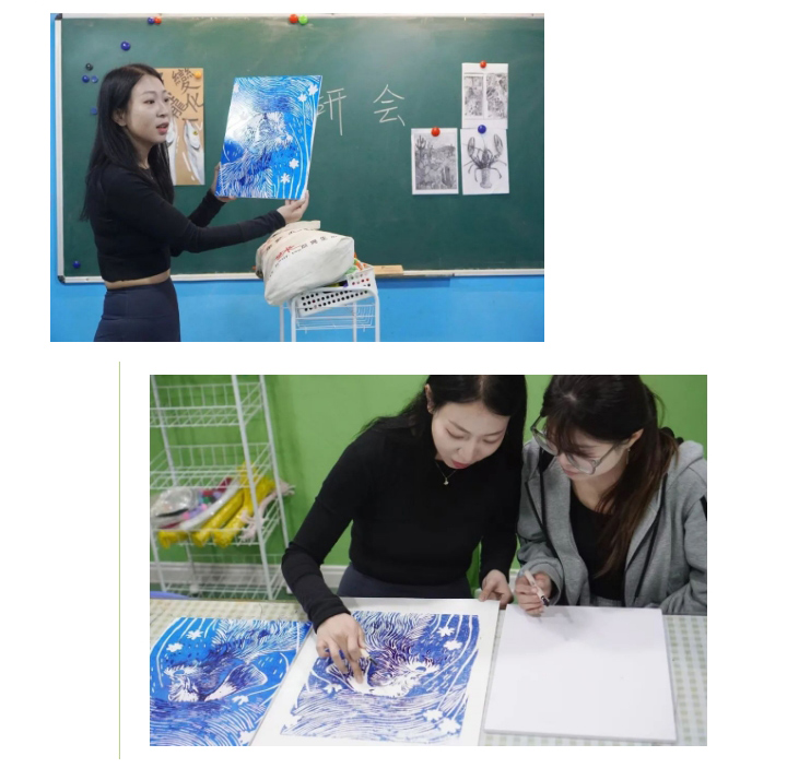 初見秦敏鴻老師,她剛結(jié)束黃島中聯(lián)周常規(guī)教研會,手里拿著剛制作完成的主題課范畫和小學(xué)員們的日常作品,在孩子們稚嫩的線條里,藏著他們對這個世界的認(rèn)知還有對生活的熱愛。