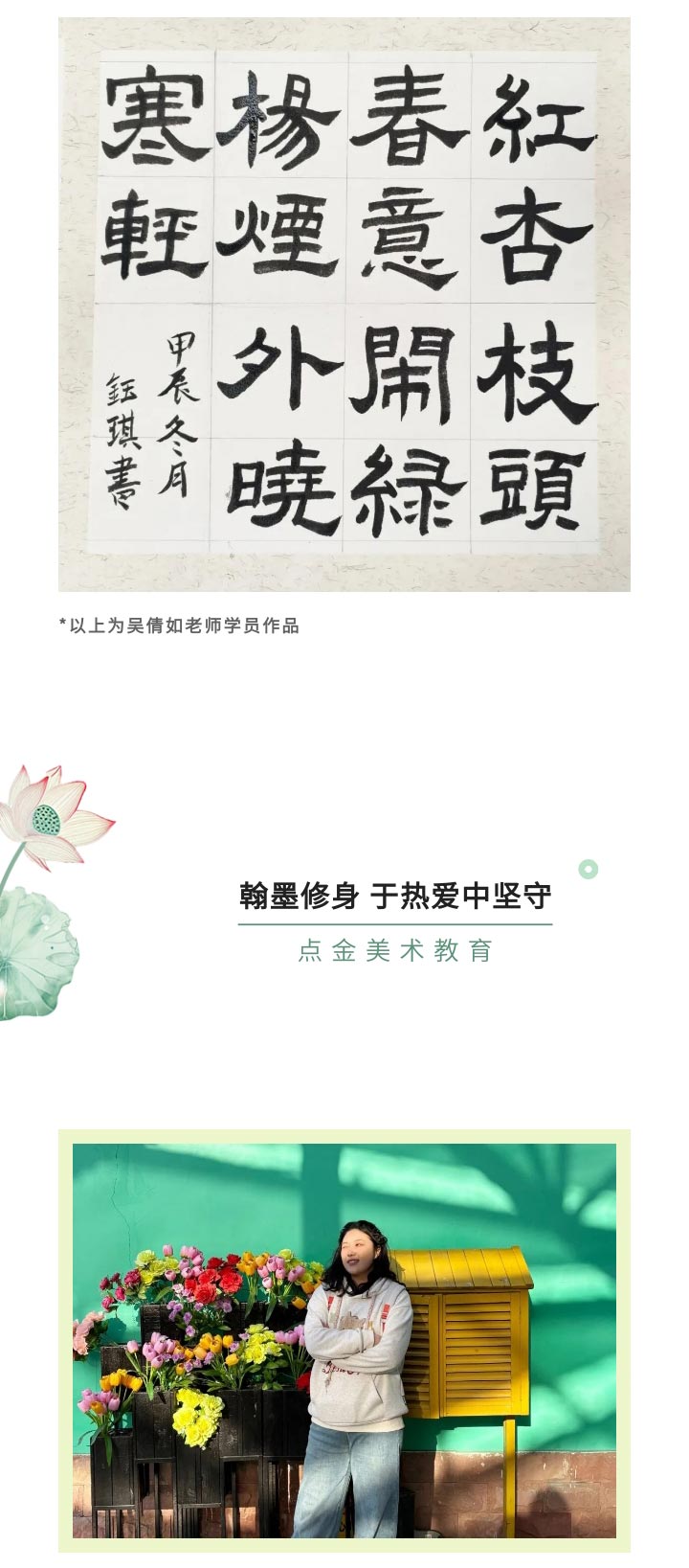 時光不語,墨香留痕。在點金美術廣闊的平臺,讓吳倩如老師得以將熱愛的書法藝術,轉化為啟迪少兒心智的力量。