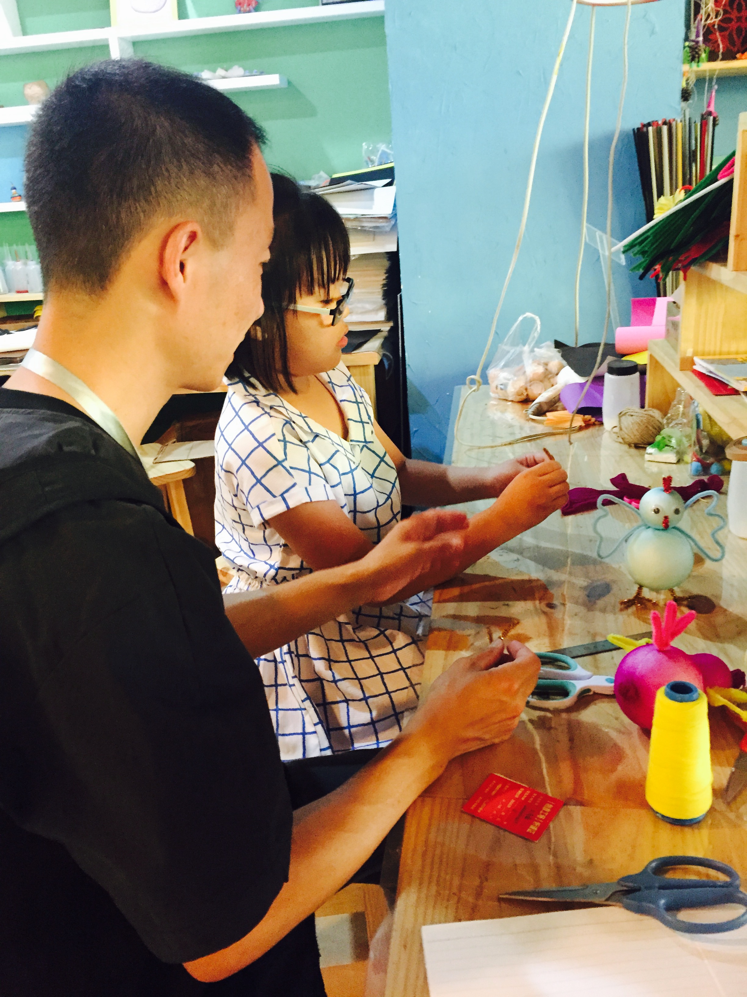 老師帶著孩子做手工,運用扭扭棒、泡沫球等材料制作漂亮的小雞