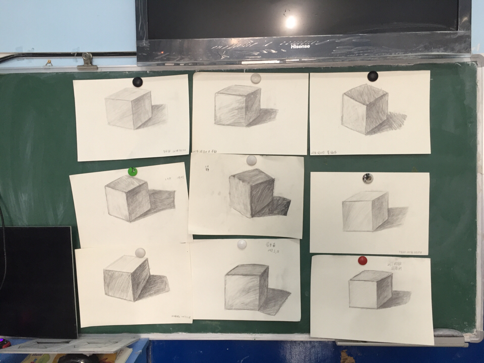 課堂上,孩子們“溫故而知新”,對一點(diǎn)透視和兩點(diǎn)透視的石膏幾何體畫法,有著不斷深入的了解,在此基礎(chǔ)上,孩子們不僅較好的畫出了石膏幾何體的結(jié)構(gòu)素描,更加深了對五大調(diào)子關(guān)系中畫出石膏幾何體的黑白灰關(guān)系的理解,任課老師評價(jià)說:“每位學(xué)員對造型的掌控能力都有不同程度的提高”。