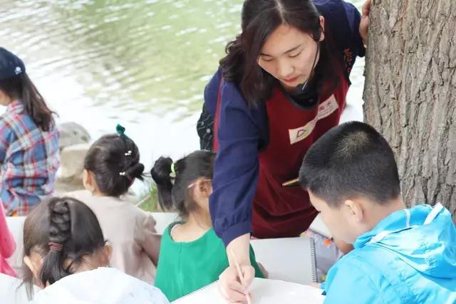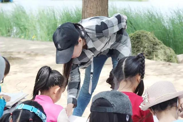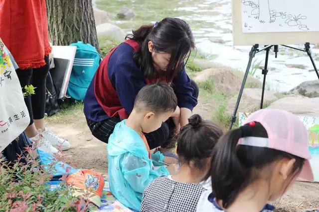 湖水碧綠清澈的環(huán)繞,孩子們坐在畫中間