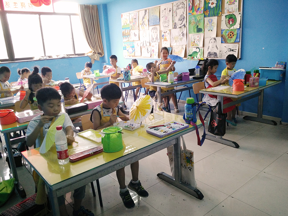 第一次在傘上作畫,孩子們熱情高漲。暑期炎熱的天氣,絲毫沒有影響到孩子們的繪畫熱情。課堂上,老師從鋪底色、起形到創(chuàng)作等角度入手,引導(dǎo)孩子們開動(dòng)腦筋把小花傘裝飾的更漂亮,每個(gè)孩子的作品都別具特色,得到了老師和家長(zhǎng)們的認(rèn)可。