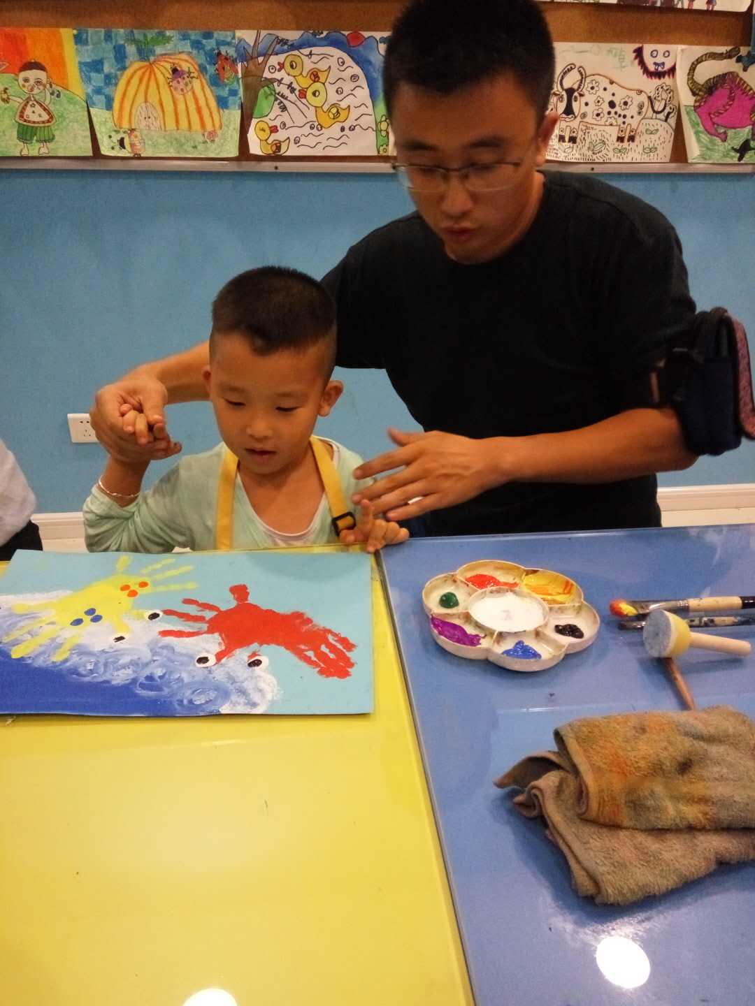 親子課程剛開始,孩子和家長們一起首先用水粉顏料畫出了大海的形狀并運用了粘棒畫出了浪花,接下來根據(jù)任課老師的引導(dǎo),將自己的手掌變?yōu)楫嫻P,并以手型為基礎(chǔ),選擇喜歡的水粉顏色,共同畫出了可愛的小螃蟹,最后用油畫棒裝飾了背景。