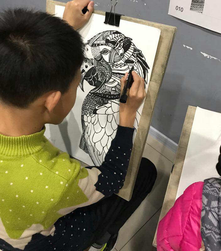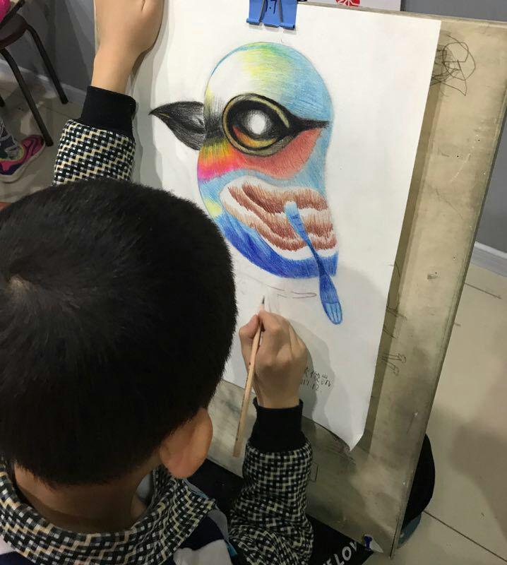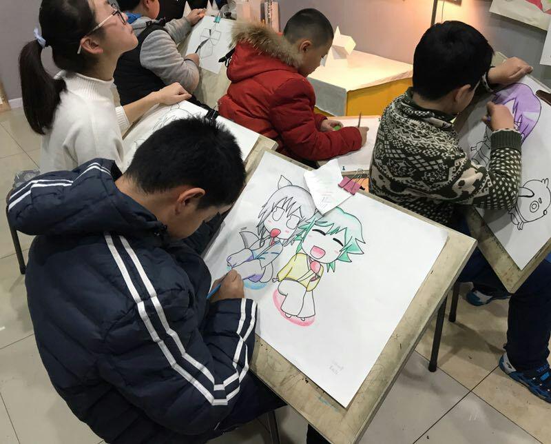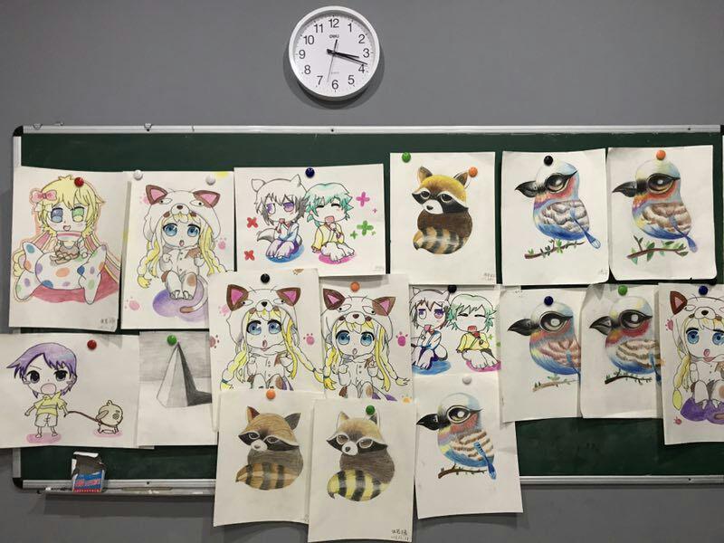 點金美術(shù)即墨教學(xué)基地動漫課堂上,孩子們興趣極濃,他們學(xué)的主動、學(xué)的輕松、學(xué)的高興。任課老師通過動漫卡通畫讓學(xué)生們獲得美術(shù)繪畫技巧的同時,也讓然了解一點藝術(shù)分析的方法,使他們了解透視原理,形象繪制以及比例關(guān)系,遮擋前后關(guān)系等等,學(xué)會一些構(gòu)圖的技巧。整個過程使學(xué)生在學(xué)到彩鉛畫的基本知識、基本技巧的同時,審美素養(yǎng)得以逐步提高,創(chuàng)新思維得以有效訓(xùn)練,整體素質(zhì)得以穩(wěn)步發(fā)展。