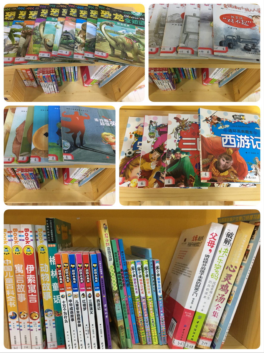 為了豐富圖書的類型,滿足3-18歲學(xué)員以及家長們的閱讀需求,中聯(lián)校區(qū)任課老師們輾轉(zhuǎn)幾大書店精心挑選圖書,并特別設(shè)立了專項(xiàng)經(jīng)費(fèi)采購了種類豐富、內(nèi)容精彩、印刷精美的圖書。開啟幼兒情商大門的國外情商培養(yǎng)繪本、 象征中國文學(xué)經(jīng)典的“四大名著”、備受孩子們歡迎的《恐龍全知道》全集、《安全標(biāo)志大全》、帶有注音的《伊索寓言》、《成語故事》、《格林童話》、《百科全書》、《十萬個(gè)為什么》等等孩子們喜愛的圖書都囊括其中,除了孩子們喜歡的圖書,還為家長們準(zhǔn)備了《心靈雞湯》、《快樂密碼》等圖書。