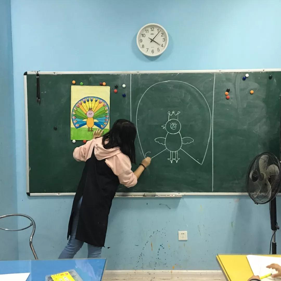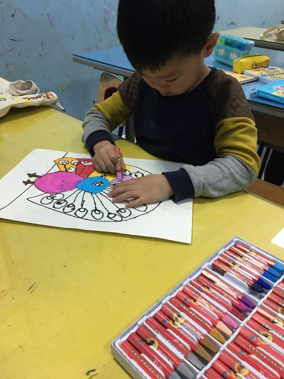 孩子們聽的仔細、學(xué)的認真,在老師的引導(dǎo)和啟發(fā)中不斷思考、創(chuàng)作,完成了屬于自己的第一幅作品——《美麗的孔雀》。