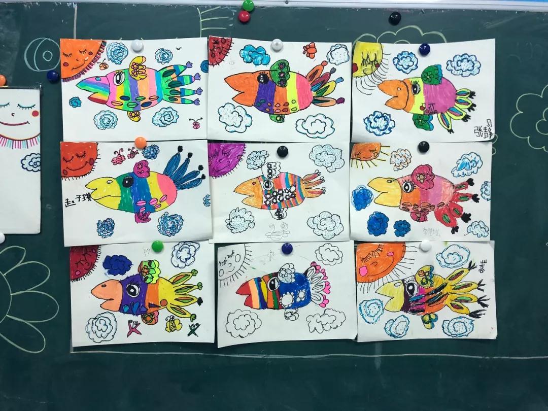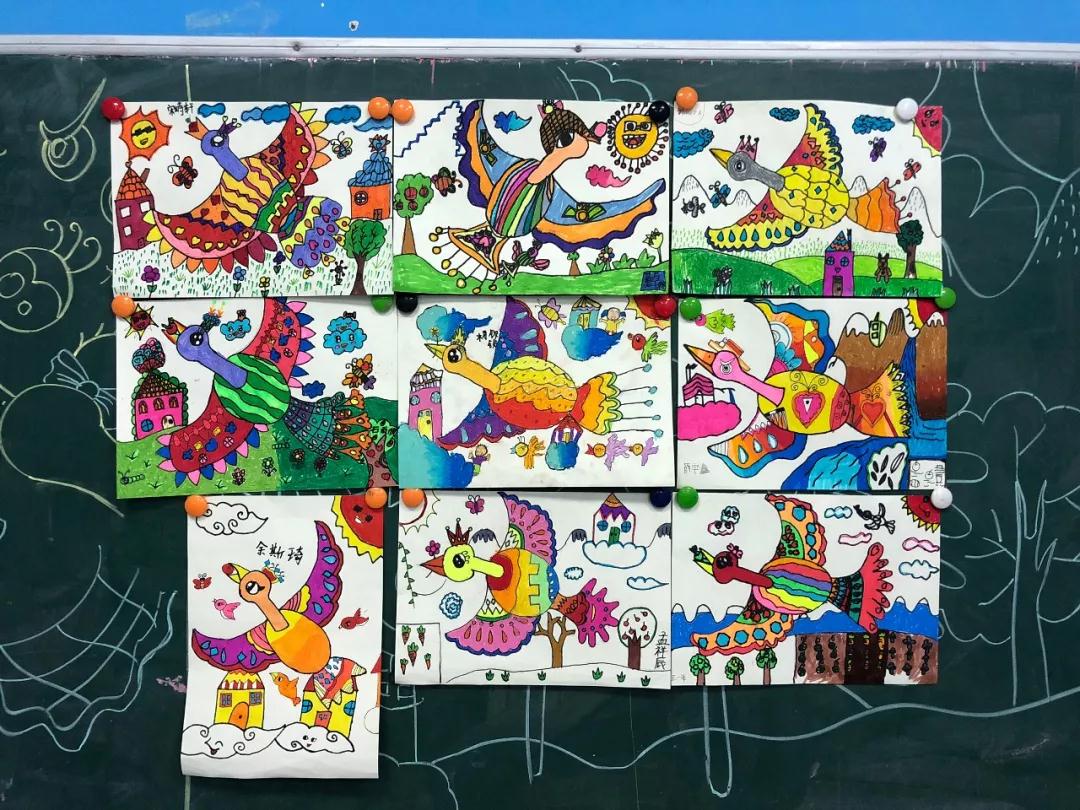 迎接孩子們的第一堂課分別是《穿花衣的烏鴉》和《美麗的大鳥》,孩子們用強(qiáng)烈的對比色、豐富的想象和獨特的表現(xiàn)手法,畫出了生動的烏鴉和大鳥。