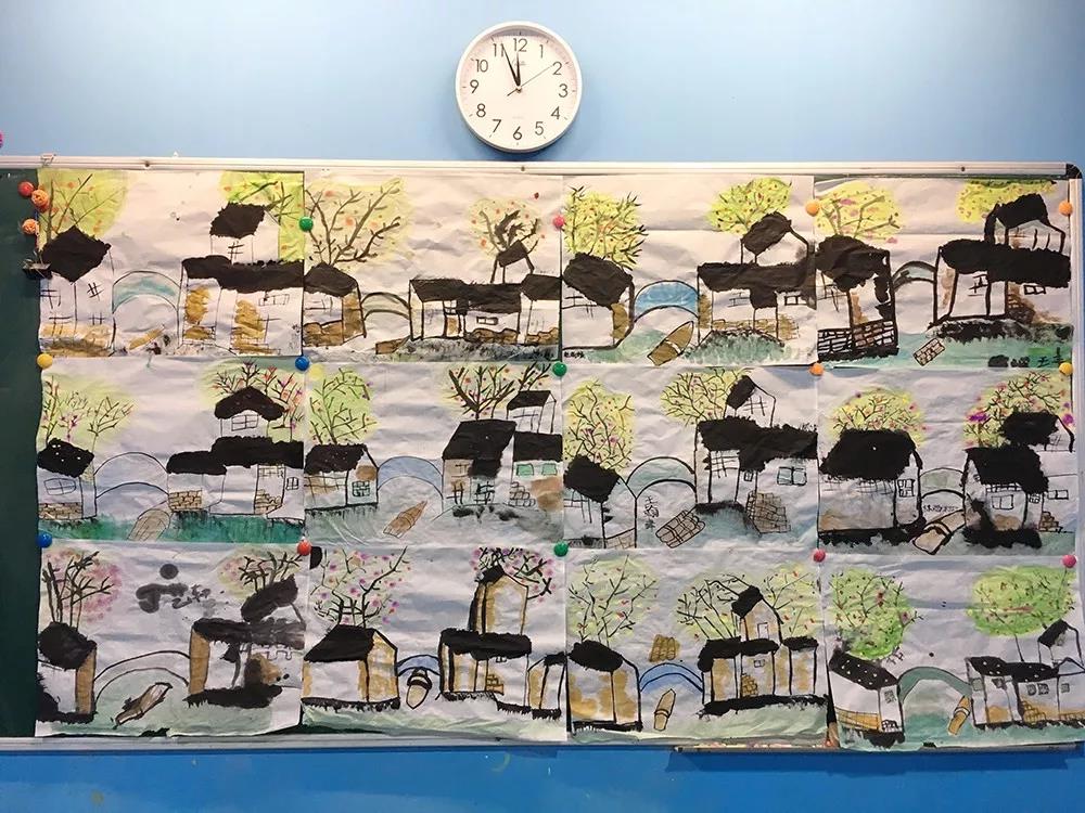 課上,老師們精心編寫了“作畫口訣”,和同學(xué)們一起邊念口訣邊作畫,口訣熟記于心,筆就能隨心而動(dòng)。在老師的帶領(lǐng)下同學(xué)們時(shí)而展現(xiàn)著潑墨揮毫的大膽與灑脫,時(shí)而又表露出細(xì)細(xì)描摹的安靜與雋秀,側(cè)鋒用筆流暢自然,中鋒行筆果斷有力,頓筆提筆間一棵棵挺拔的小樹拔地而起,一簇簇“勿忘我”、菊花炫麗的開放,楓葉、水果、金魚、葫蘆、絲瓜、江南水鄉(xiāng)等等的動(dòng)植物、風(fēng)景都成為我們創(chuàng)作的題材。認(rèn)真觀察,有節(jié)奏、有變化的調(diào)和水與墨的關(guān)系,有的放矢的處理每個(gè)細(xì)節(jié),孩子們的作品可圈可點(diǎn),不僅表現(xiàn)了物體的本質(zhì),而且基本能夠達(dá)到“形神兼?zhèn)洹?、“氣韻生?dòng)”的藝術(shù)效果。幾堂課下來,孩子們對中國畫有了更加深入的認(rèn)識(shí),作畫過程也更加熟練自如,對中國畫以及中國傳統(tǒng)文化的喜愛更是有增無減。
