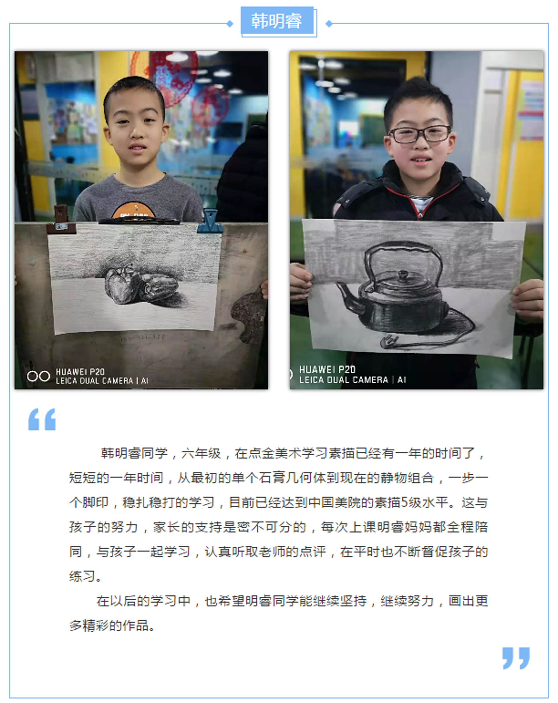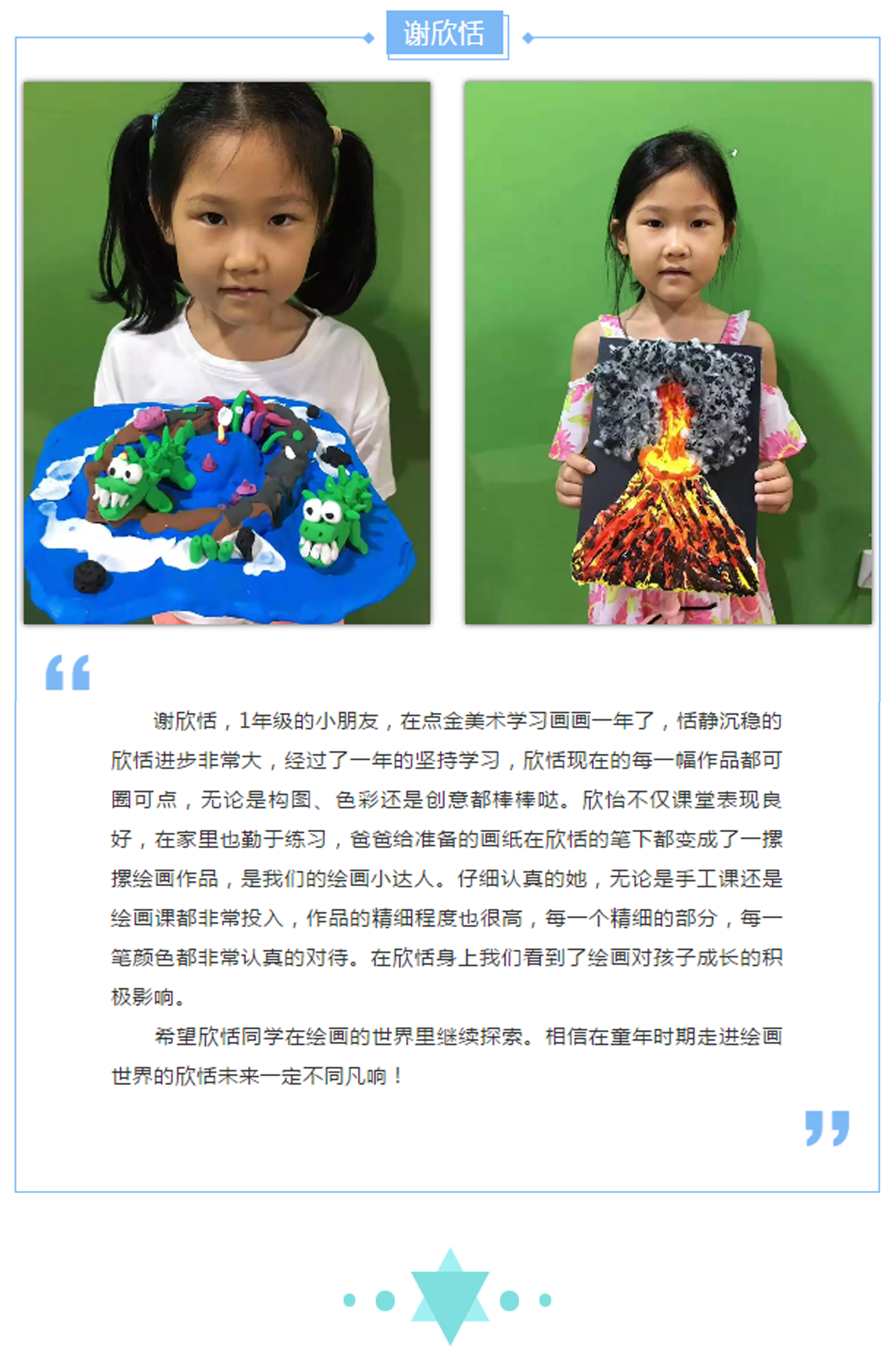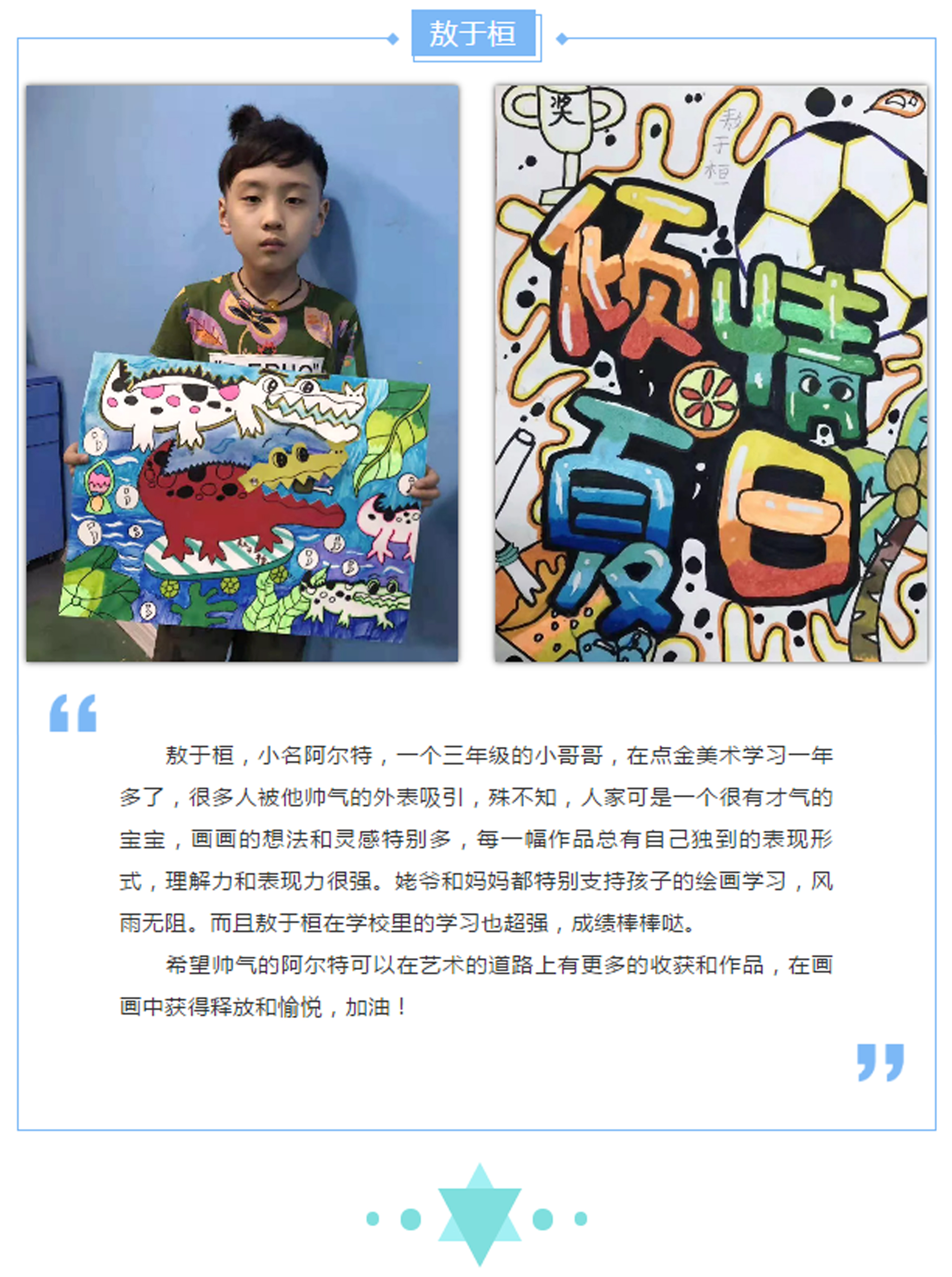 隨著和煦的陽光灑滿美麗的西海岸,點(diǎn)金美術(shù)黃島中聯(lián)校區(qū)迎來了本周的繪畫小明星,讓我們一起認(rèn)識(shí)本周登上明星榜的小朋友。