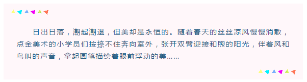 此次戶外寫生活動(dòng),在孩子們心中留下了很多美好的記憶,一起成長(zhǎng)的點(diǎn)滴,終將成為孩子們美好人生中的有趣回憶。如果不讓孩子去體驗(yàn),他們將永遠(yuǎn)也不能知道,在一棵樹下有怎樣的樂園,在一朵花里有怎樣的美好,接下來,讓我們一起期待點(diǎn)金美術(shù)的下一次戶外寫生課堂吧!