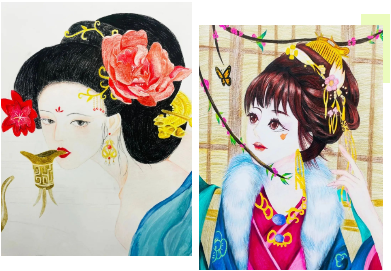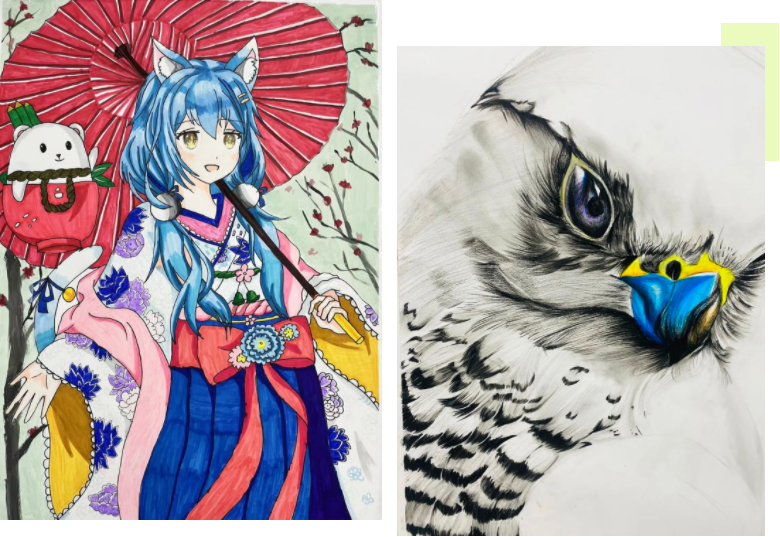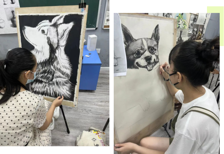 隨著課程的深入和學(xué)員能力的提升,老師們針對(duì)不同學(xué)員的學(xué)習(xí)進(jìn)度,開(kāi)展了不同的課程,個(gè)性化教學(xué)。對(duì)于基礎(chǔ)相對(duì)好的學(xué)員,開(kāi)展了2開(kāi)大幅彩鉛教學(xué),這對(duì)學(xué)員來(lái)說(shuō)是一種新的挑戰(zhàn),但經(jīng)過(guò)老師們的悉心指導(dǎo)和學(xué)員們的耐心描繪,作品也近乎完美呈現(xiàn)。
