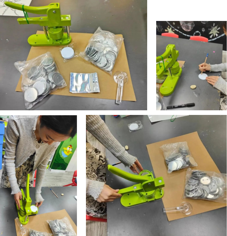 集繪畫和手工于一體的胸章制作,每一枚都是小學(xué)員們的私人定制。他們將自己喜歡的動(dòng)畫片人物、小動(dòng)物、小標(biāo)語(yǔ)等等繪在胸章上,成為了一個(gè)個(gè)獨(dú)特的畫作。