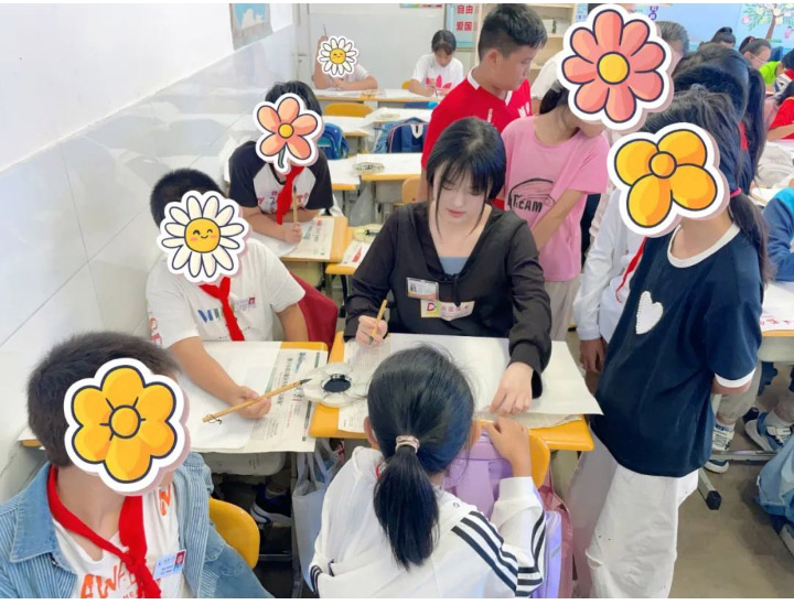 公益課堂上,老師們通過多媒體手段,采用圖片、視頻、文字說明等方式向?qū)W員們詳細(xì)介紹了漆扇的制作方法和文字起源、演變、發(fā)展等。點(diǎn)金美術(shù)的老師現(xiàn)場示范,在演示過程中介紹了如何制作漆扇和簡單的書寫規(guī)律,同時還分享了漆扇的賞析方法。