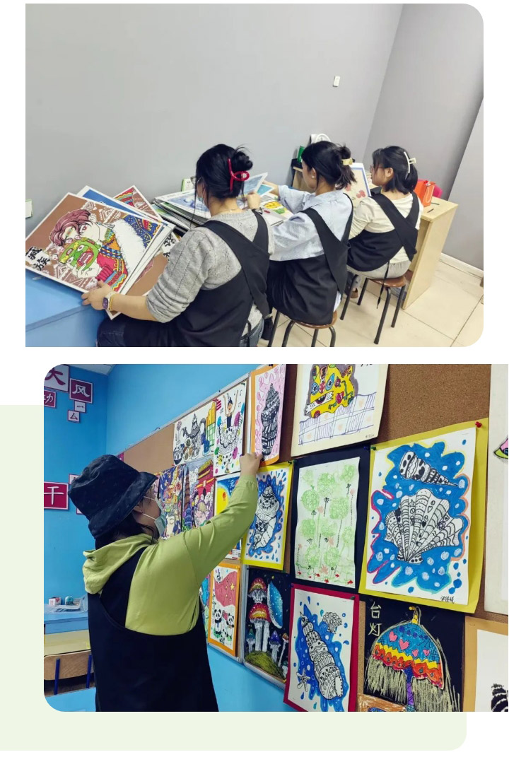 孩子們精心完成的作品被老師們用心的收藏與展示。在課后老師們根據(jù)所要展示的區(qū)域和內(nèi)容進(jìn)行精心挑選,讓孩子們?cè)谔嵘囆g(shù)技能的同時(shí)也給到他們展示自我的小小平臺(tái)。