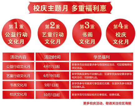 點金美術(shù)“深耕15年,美育萬家桃李”校慶系列活動即將開啟,歡迎全校師生共同迎接、期待15周年校慶的到來。