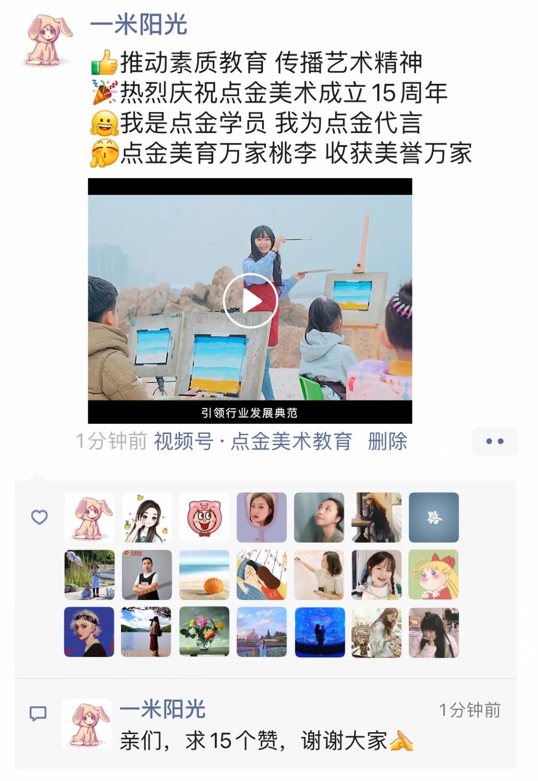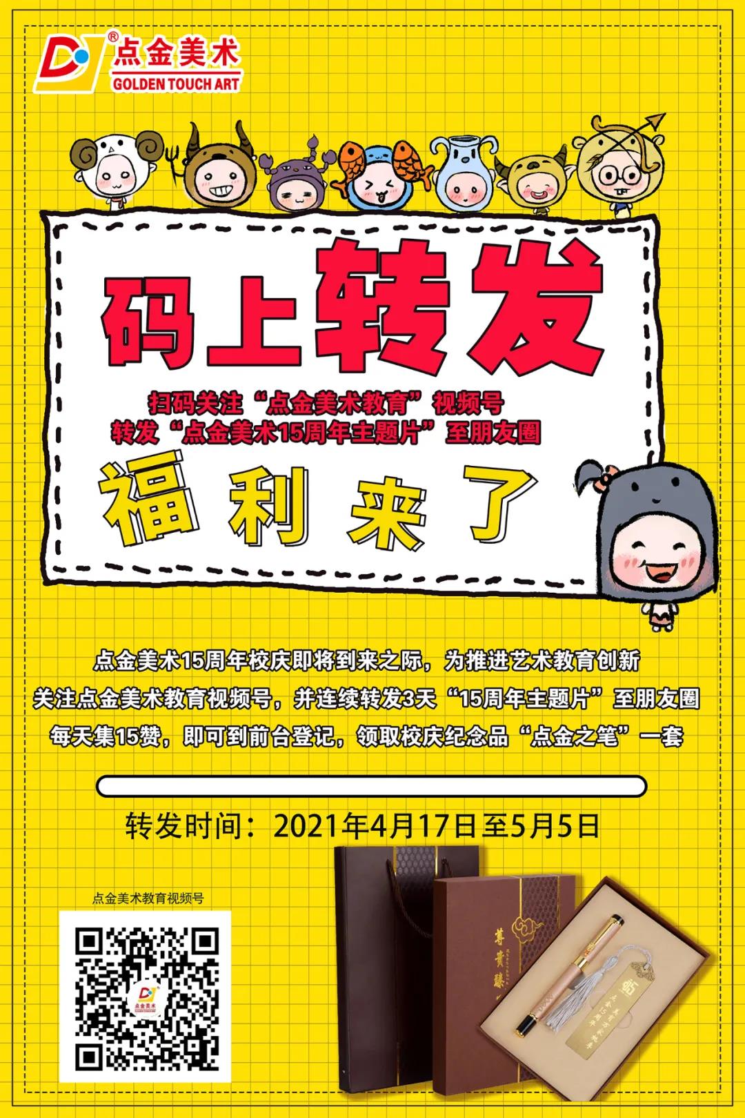 自4月17日起,關(guān)注“點金美術(shù)教育”視頻號,并配合代言文字,連續(xù)轉(zhuǎn)發(fā)3天“15周年主題片”至朋友圈,每天集15贊,即可到校區(qū)前臺登記,領(lǐng)取校慶紀念品“點金之筆”一套。