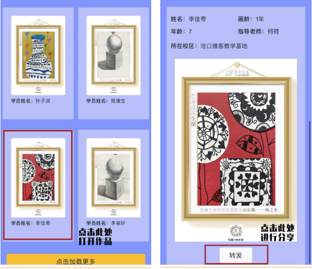 為了方便學員畫作的分享交流,點金美術特設置了【轉發(fā)】的功能,可供學員們將自己的作品制作成鏈接,分享到朋友圈或對話中,與伙伴們交流探討。