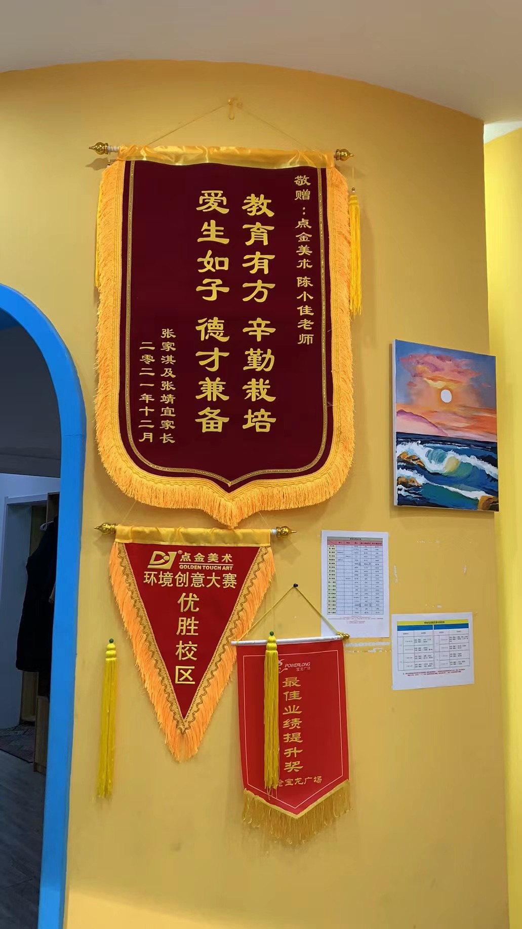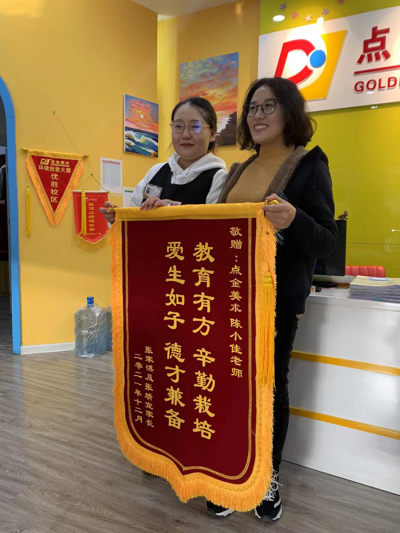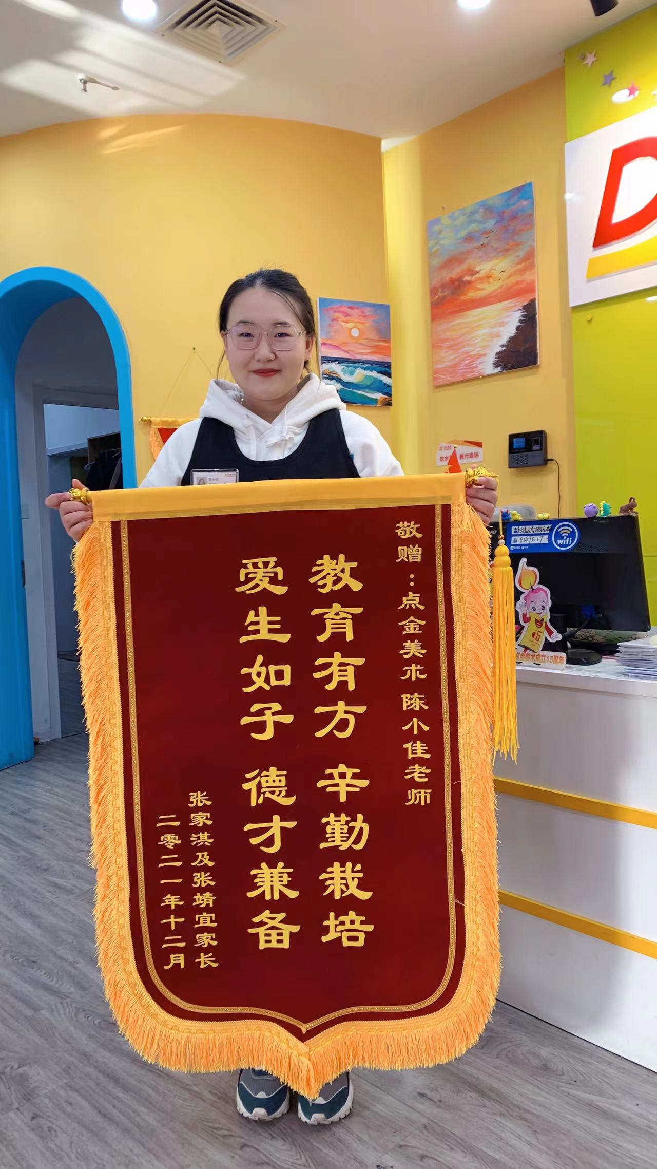 責(zé)任與擔(dān)當(dāng)從來與年齡無關(guān)。12月18日,李滄寶龍張靖宜、張家淇家長,為陳小佳老師送來了錦旗,“教育有方,辛勤栽培,愛生如子,德才兼?zhèn)?/strong>”,錦旗上簡短的幾句話,表達(dá)了家長對陳小佳老師和對點(diǎn)金美術(shù)的認(rèn)可。
