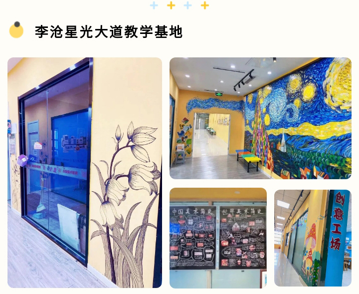 李滄寶龍校區(qū)利用油畫,石膏、肌理巧妙組合,分兒童畫、素描區(qū)域,區(qū)分主題進行環(huán)創(chuàng)設計。各種綜合材料豐富著校區(qū),將校區(qū)的墻面打造成一個立體、多彩的空間。