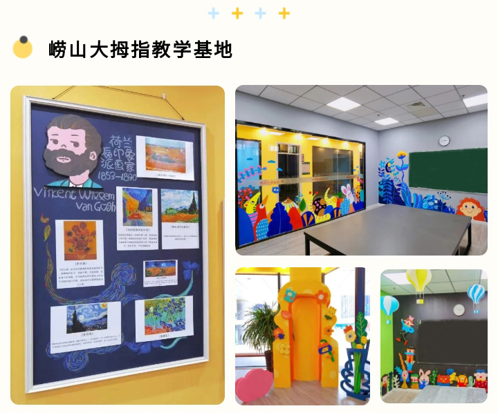 嶗山大拇指校區(qū)整體色調采用高飽和度的顏色,在幾個重要節(jié)點設置打卡拍照區(qū)、名人畫家區(qū)、藝術作品展示區(qū)、藝術角等,提高校區(qū)藝術氛圍,使來上課的老學員擁有一個更具藝術氛圍的學習環(huán)境。