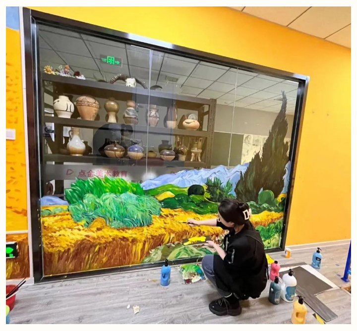 確立主題風格、尋找材料素材、定制細化方案、現(xiàn)場精心繪制。點金美術各校區(qū)老師們用扎實的基本功,著力于校區(qū)環(huán)創(chuàng),全力打造一個充滿樂趣又不失專業(yè)水準的藝術殿堂。