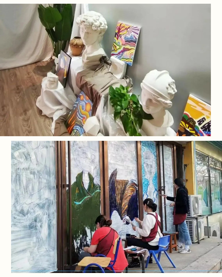 星光大道校區(qū)更新校區(qū)門口墻面內容,校區(qū)內部走廊底部增加趣味彩繪,提高藝術氛圍感。校區(qū)玻璃部分增加美術史內容,豐富學員們繪畫知識。