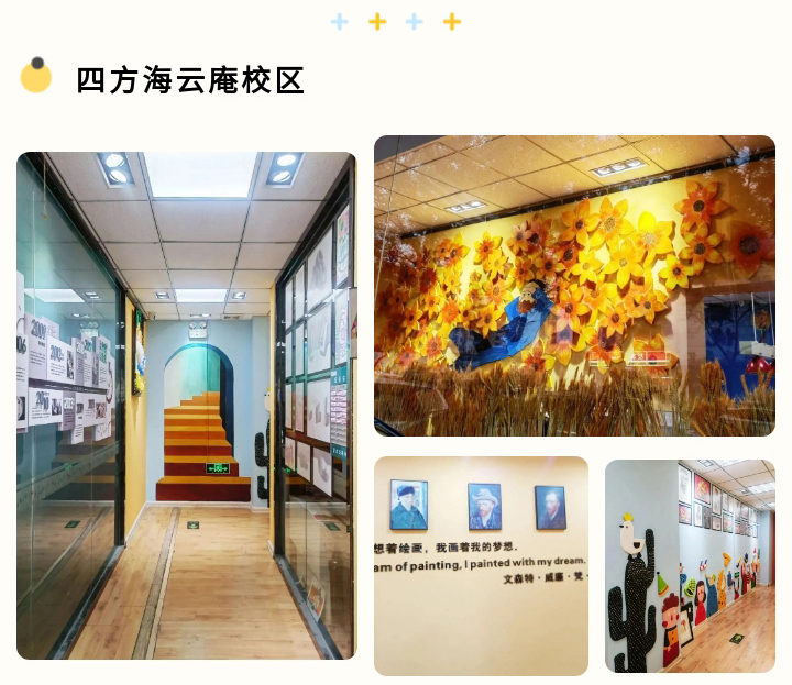 每個校區(qū)都注重整體性和個性化的統(tǒng)一。在黃色明朗的背景下,各校區(qū)按照自己預先設計的主題,進行統(tǒng)一的創(chuàng)作。再針對不同教室的功能,進行差異化設計。既考慮到整體風格的統(tǒng)一性,又要考慮到不同教室的個性化,同時要兼具一定的藝術性。