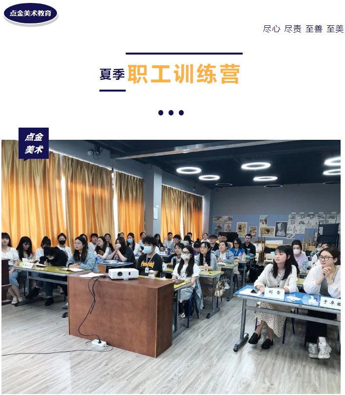 授人魚,不如授人以漁。相信通過這次的夏季職工訓練營,可以幫助新晉教師們對于未來的工作與發(fā)展持有更多的信心,更快的融入工作環(huán)境,適應工作崗位,增強歸屬感,更好的融入點金美術(shù)大家庭。