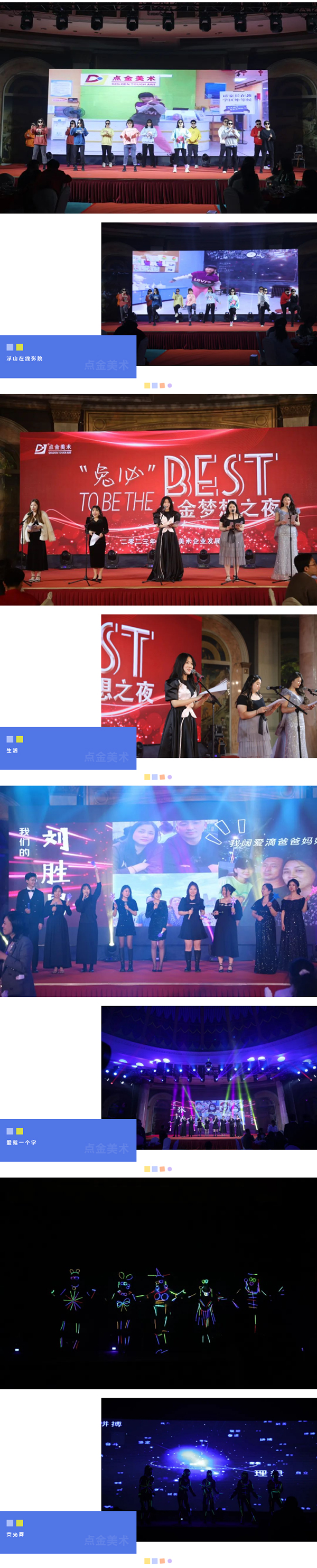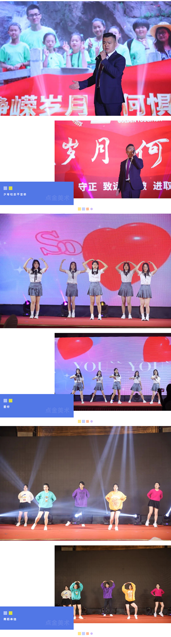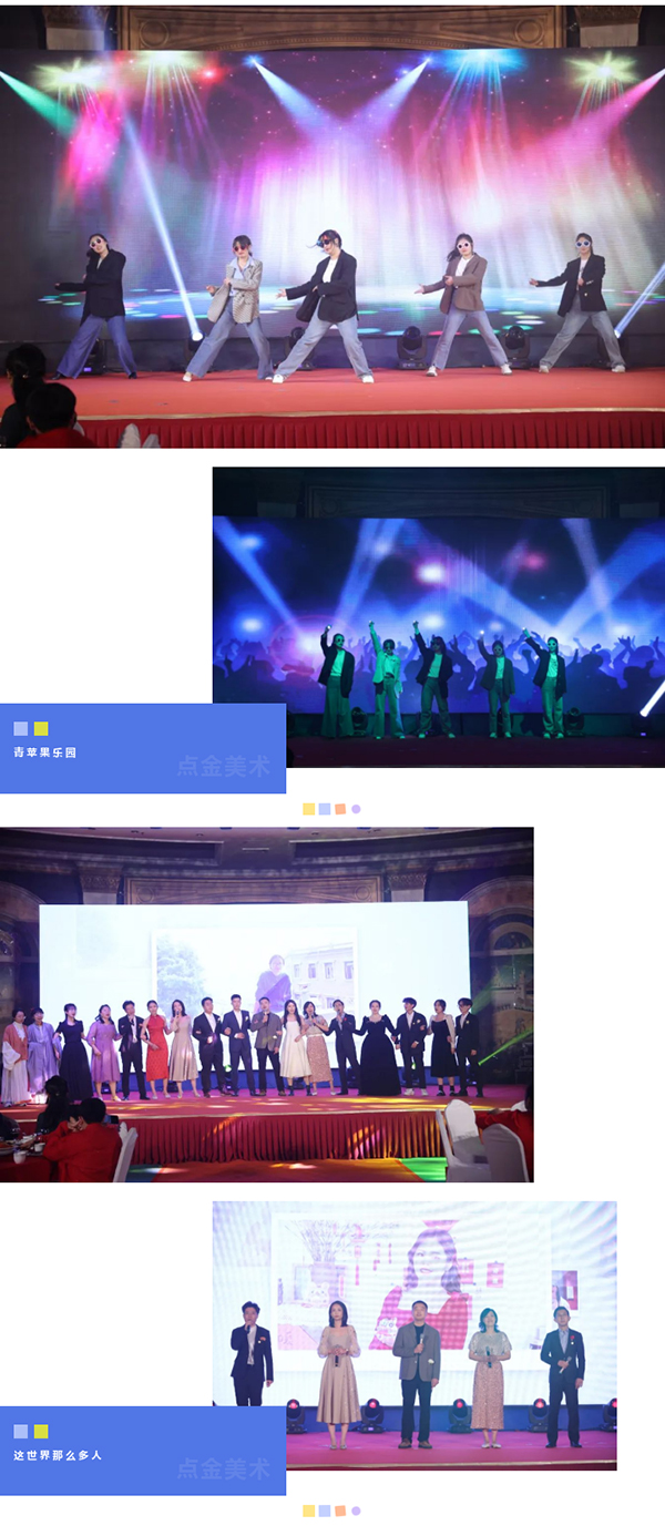 在這個充滿夢想的舞臺上,各位老師用他們最活潑、最有精氣神的一面,展示了點(diǎn)金美術(shù)蓬勃向上的青春活力,美好的時光總是短暫的,但是幸福的回憶總是美好的,愿這歡聲笑語,充滿溫情浪漫的時刻,永駐我們彼此心間。