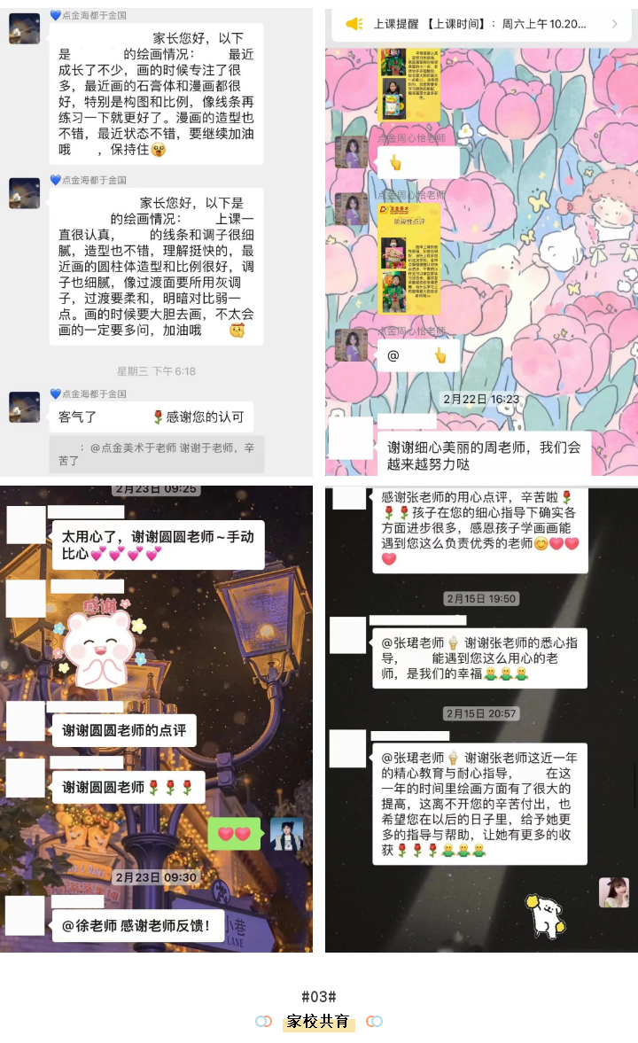 進一步加強家校聯(lián)系,整合家校資源,形成教育合力,共促學員發(fā)展。通過家長課堂、班級群溝通等方式,關(guān)注家長和學員的藝術(shù)需求,全方面提升學員的能力,個性化教學,助力每個點金學員的藝術(shù)提升。