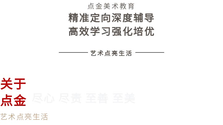 點金美術(shù)與夢工場等行業(yè)知名品牌、機構(gòu)共享聯(lián)動,著力于美術(shù)高考研究與教學(xué)培訓(xùn),給廣大美術(shù)考生提供更深入的專業(yè)引領(lǐng),學(xué)業(yè)、職業(yè)的系統(tǒng)規(guī)劃,幫助學(xué)員在美術(shù)專業(yè)領(lǐng)域形成強大競爭力與自身風(fēng)格,在藝術(shù)道路上越走越遠。