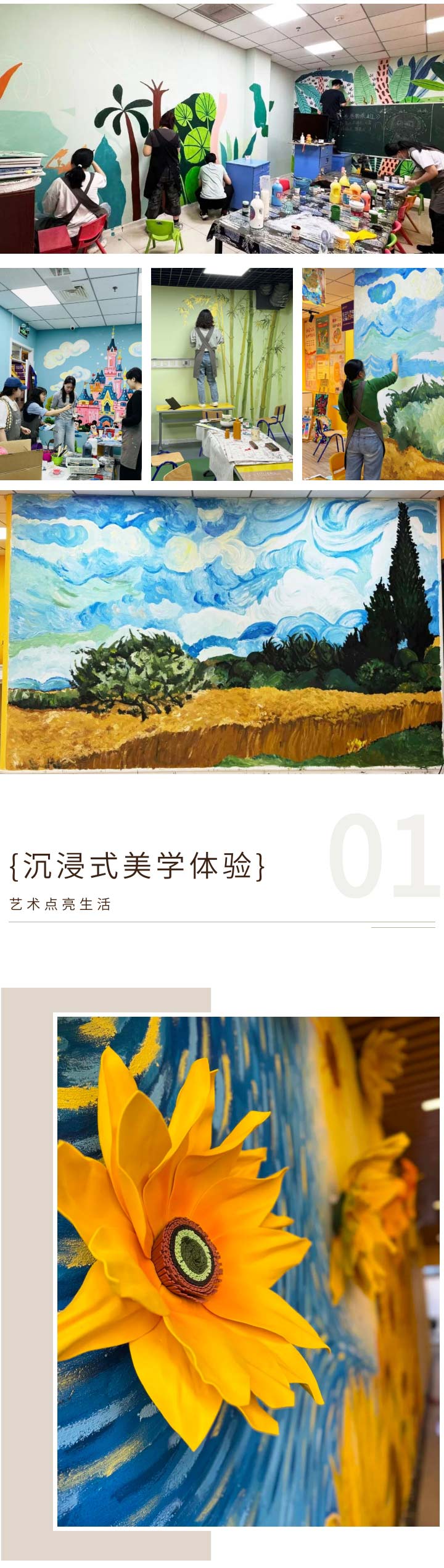 此次環(huán)境升級并非單純的視覺改造,更是點金美育理念的具象化表達,充滿活力的向日葵元素、孩子們喜歡的動漫元素、奇妙的自然元素等等,都在向孩子們傳達出“藝術點亮生活”的理念,通過積極、向上的引導,用藝術環(huán)境提升孩子們的幸福感,幫助他們塑造健康、樂觀、積極的人生態(tài)度。