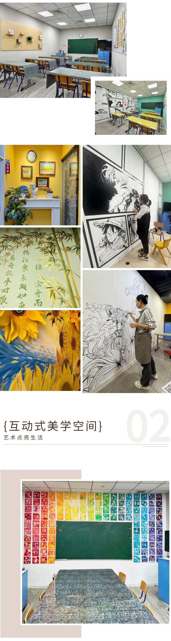 此次環(huán)創(chuàng)更新,主要針對教室與部分公共區(qū)域,按照全新環(huán)創(chuàng)標準統(tǒng)一,根據每個教室的課程不同,進行了巧妙的布局設計,滿足多元創(chuàng)作需求,細節(jié)之處盡顯專業(yè)與用心。