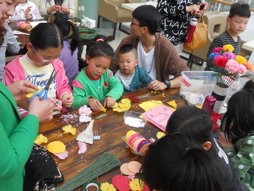 活動(dòng)現(xiàn)場,點(diǎn)金美術(shù)精選了點(diǎn)金手工課中的刮畫、斑馬大頭筆、康乃馨紙花等精品手工課程,現(xiàn)場小朋友踴躍參與,很多家長也積極投入到手工制作當(dāng)中,現(xiàn)場氣氛其樂融融。孩子們一雙雙稚嫩的小手,不太熟練地拿著小剪刀,認(rèn)真地制作著送給媽媽的小禮物。一堂小小的手工課,通過孩子與家長的共同參與,讓這個(gè)母親節(jié)禮物具有了特別的意義,受到了廣大家長的好評(píng)。