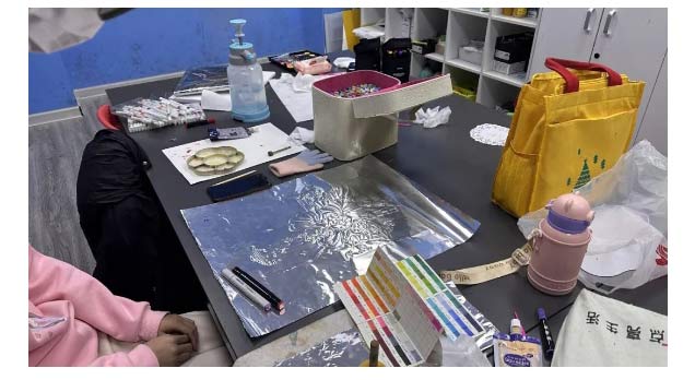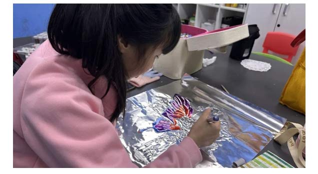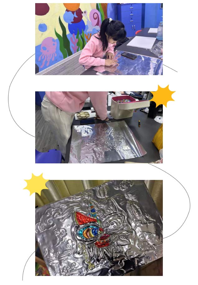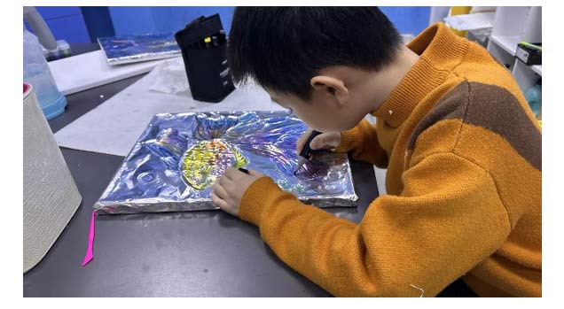在點金新都心教學基地,學員們學習錫箔紙刻印技法,感受綜合繪畫材料的魅力。這種獨特的藝術形式將繪畫技巧與手工技巧完美結合,讓學生在探索色彩搭配的過程中獲得了更多的靈感。