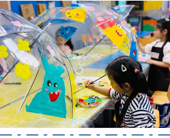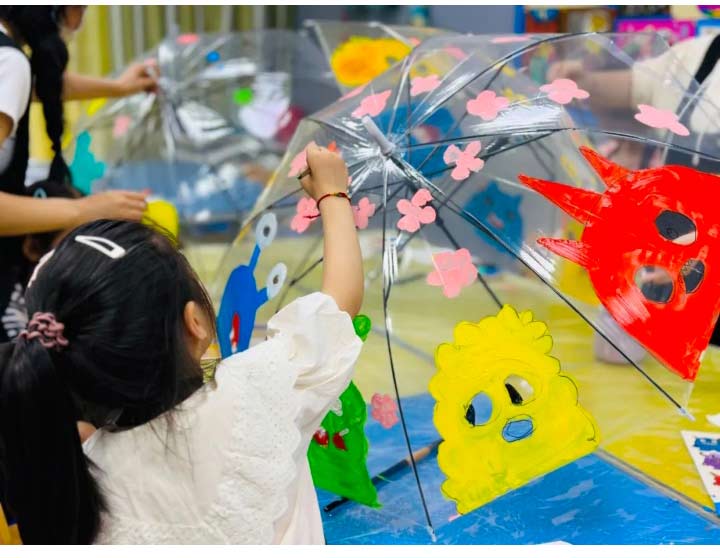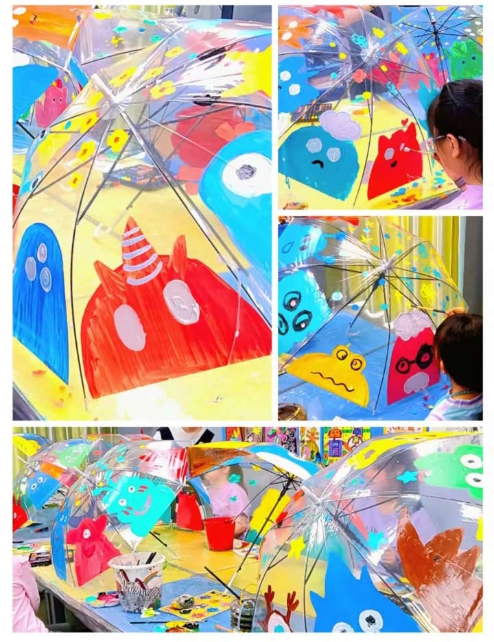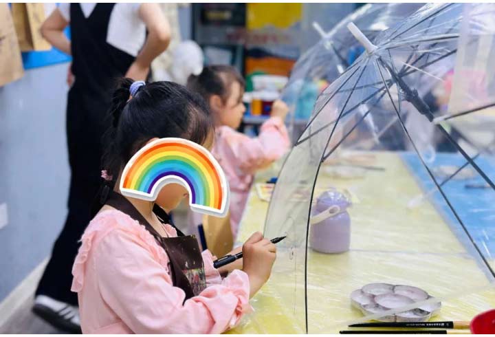 針對于年齡偏小的學(xué)員,覆蓋力強(qiáng)、顏色鮮艷的丙烯顏料會鍛煉他們對色彩的感知能力,而且在光滑的雨傘上作畫,也鍛煉了孩子們的控筆能力。