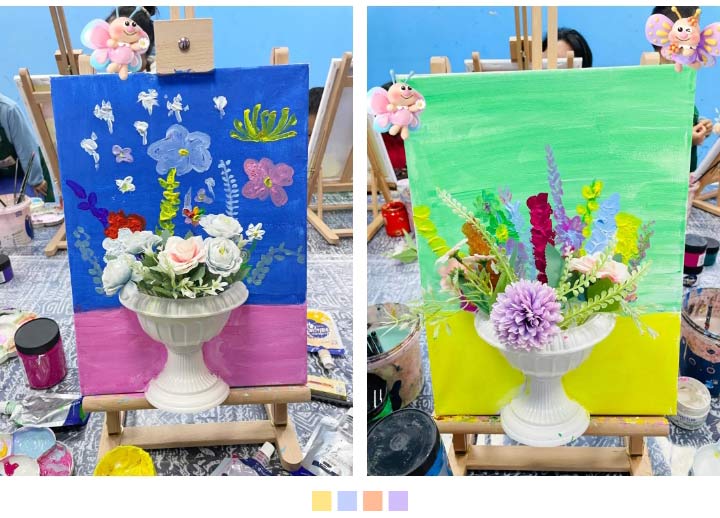 在課程中,用塑料花盆及油畫框進(jìn)行黏貼組合,使用丙烯、水粉顏料進(jìn)行底色的創(chuàng)作,再以彩泥作為“花土”,在立體的花盆中加入根據(jù)背景色彩搭配的永生花,每一位學(xué)員都創(chuàng)作出了獨(dú)屬于自己的創(chuàng)意畫作。