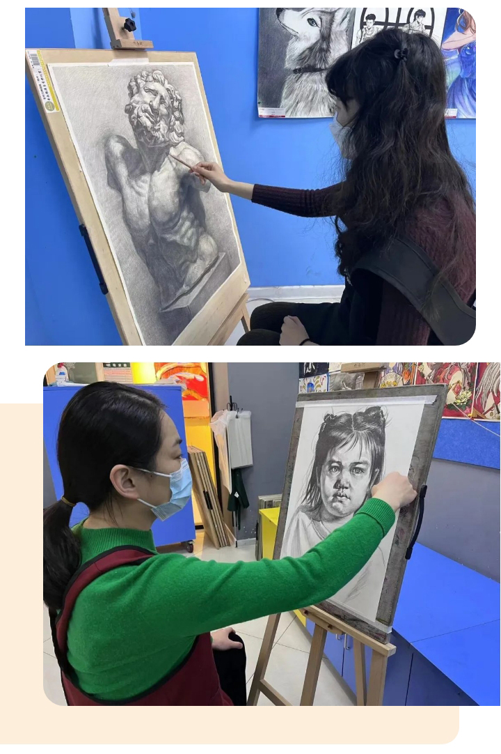 作為美術(shù)教師除了在日常的教研外,老師們還著力于不斷提升自我藝術(shù)修養(yǎng)以及夯實自身藝術(shù)技能。在藝術(shù)的學習中,練習是永無止境的,不斷精進自身繪畫水平,也為學員們做好榜樣。