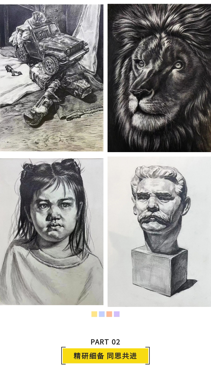 通過精微素描、頭像、靜物等繪畫練習,不斷增加對于畫面的把控程度,終身學習,時刻保持空杯心態(tài)。