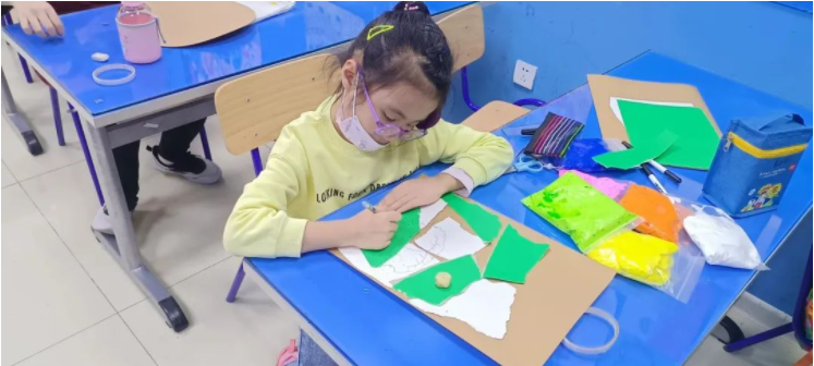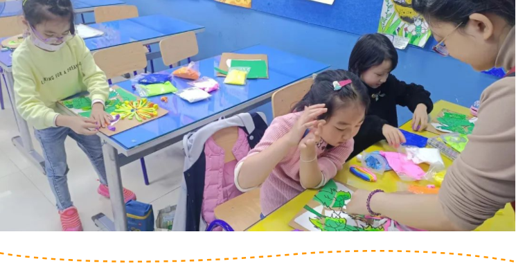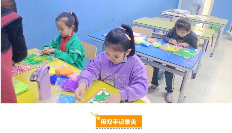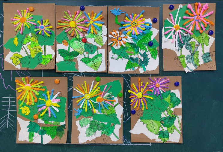 撕、貼、畫、捏... ...拋棄了原有的傳統(tǒng)的平面表現形式,運用多種藝術技法,結合多種材料,用各色粘土揉搓成細條,黏貼花瓣的形狀,不僅鍛煉了動手能力,還增加了課堂的趣味性。