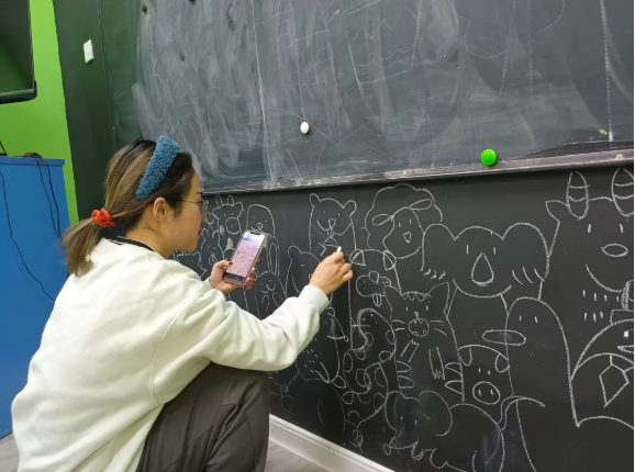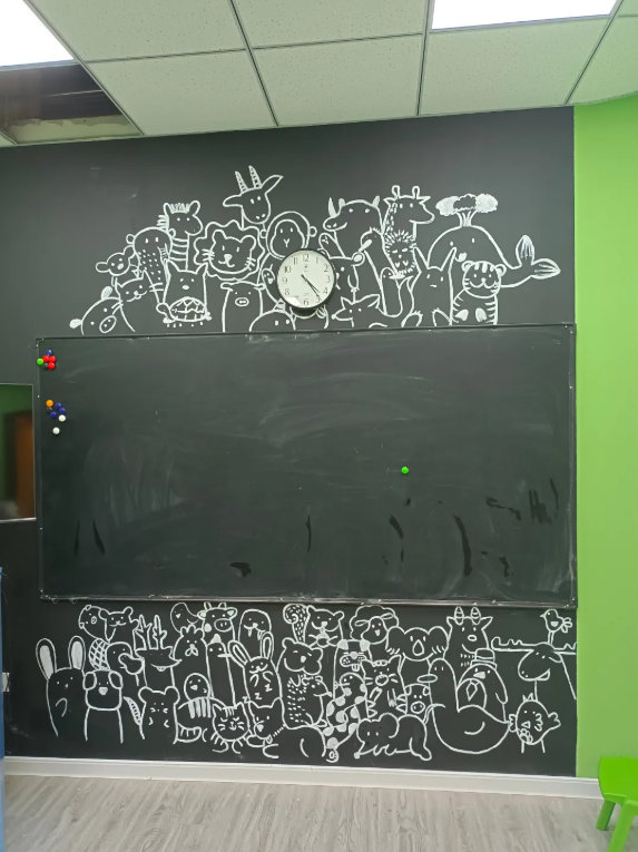 此次的環(huán)創(chuàng)區(qū)域分為啟蒙教室黑板墻以及各級別教室門口走廊兩個部分,整體以手繪為主。不同的區(qū)域,設(shè)置不一樣的主題,給小學(xué)員們不同的心理體驗。
