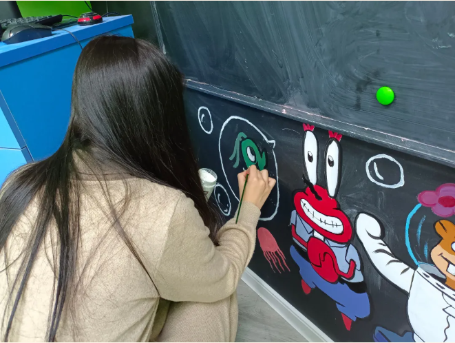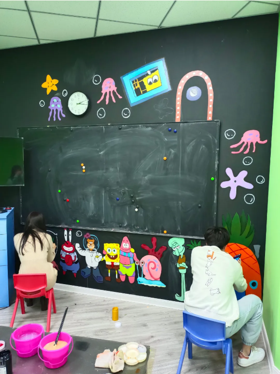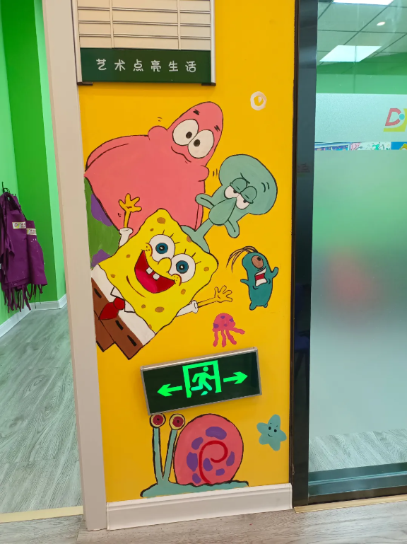 第二教室則運用了彩色為主,主題是學(xué)員們都熟知的海綿寶寶動畫形象,顏色絢麗豐富,讓小學(xué)員們贊口不絕。