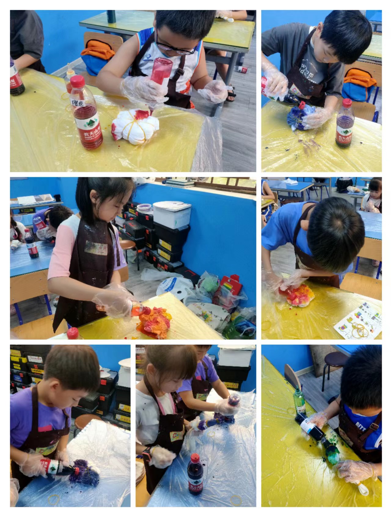 在制作過(guò)程中,學(xué)員們逐漸掌握了多種扎法和染色技術(shù)。通過(guò)巧妙的運(yùn)用這些扎法和技巧,最后染成的紋樣和圖案各不相同,圖塊色彩鮮艷,顏色層次分明,顯得自然雅致而又新奇,富有極強(qiáng)的趣味性和藝術(shù)性。