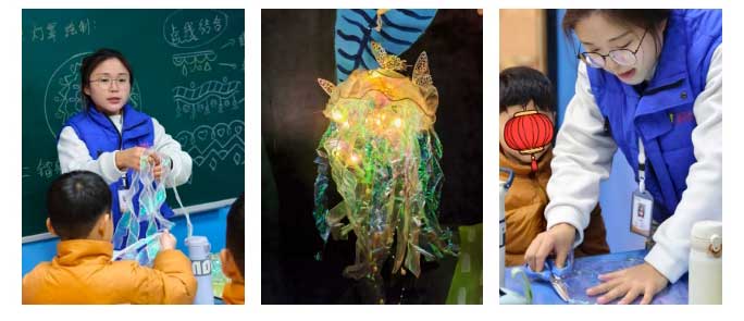 從水母的“身體”裝飾,到用柔軟的彩繩模擬水母的“觸須”,再到小心翼翼地安裝燈帶,每一個(gè)環(huán)節(jié)都讓孩子們?nèi)褙炞ⅰ?/span>