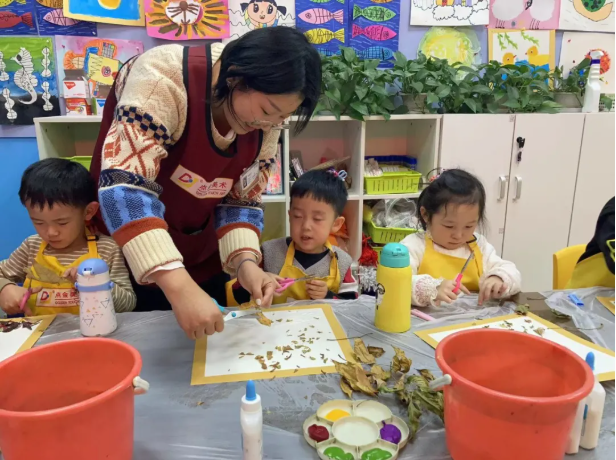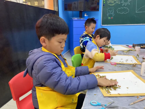 回味了學(xué)員們對秋天景色的想象,激起了他們上課的興趣,同時(shí)運(yùn)用了黑板上老師給學(xué)員們的動(dòng)物素材,讓孩子們運(yùn)用自己準(zhǔn)備的樹葉拼貼表達(dá)對秋天的留戀。